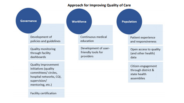 First, the Program will improve governance through the development of clinical protocols/guidelines; monitoring quality of care using facility dashboards; introducing and scaling up clinical governance and other quality improvement initiatives (quality committees, hospital quality networks, continuous quality improvement, and strengthened supervision/mentoring); and facility certification. With respect to certification, the Program supports national accreditation for 370 primary-, secondary-, and tertiary-level health facilities in the public sector. Two types of certification will be sought: National Quality Assurance Standards (NQAS) for primary- and secondary-level facilities and National Accreditation Board for Hospitals and Healthcare Providers (NABH) for tertiary-level facilities (medical colleges). The former has been used in the public sector in India while the the latter has been used in the private sector. Tamil Nadu currently has three public secondary hospitals certified with NQAS or NABH and four primary health centers (PHCs) and community health centers (CHCs) certified with NQAS. This set of quality improvement measures will improve accountability by strengthening the feedback loops within health facilities as well as between health facilities and the state.