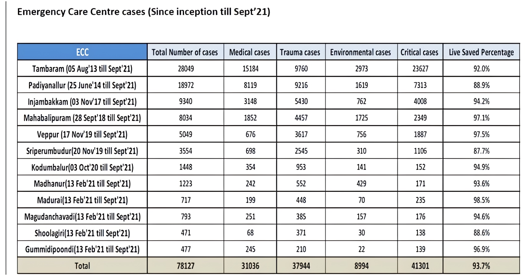 Emergency Care Centres are established for stabilizing the critical cases during long distance transport, especially in highways. This enables the critical cases to receive timely medical intervention within the Golden Hour which also significantly reduces the mortality rate. ECC is a three bedded centre equipped with doctors and advanced paramedics available 24x7 and provided with emergency drugs and advanced life saving equipments like ventilator, defibrillator with multi Para monitor, etc.